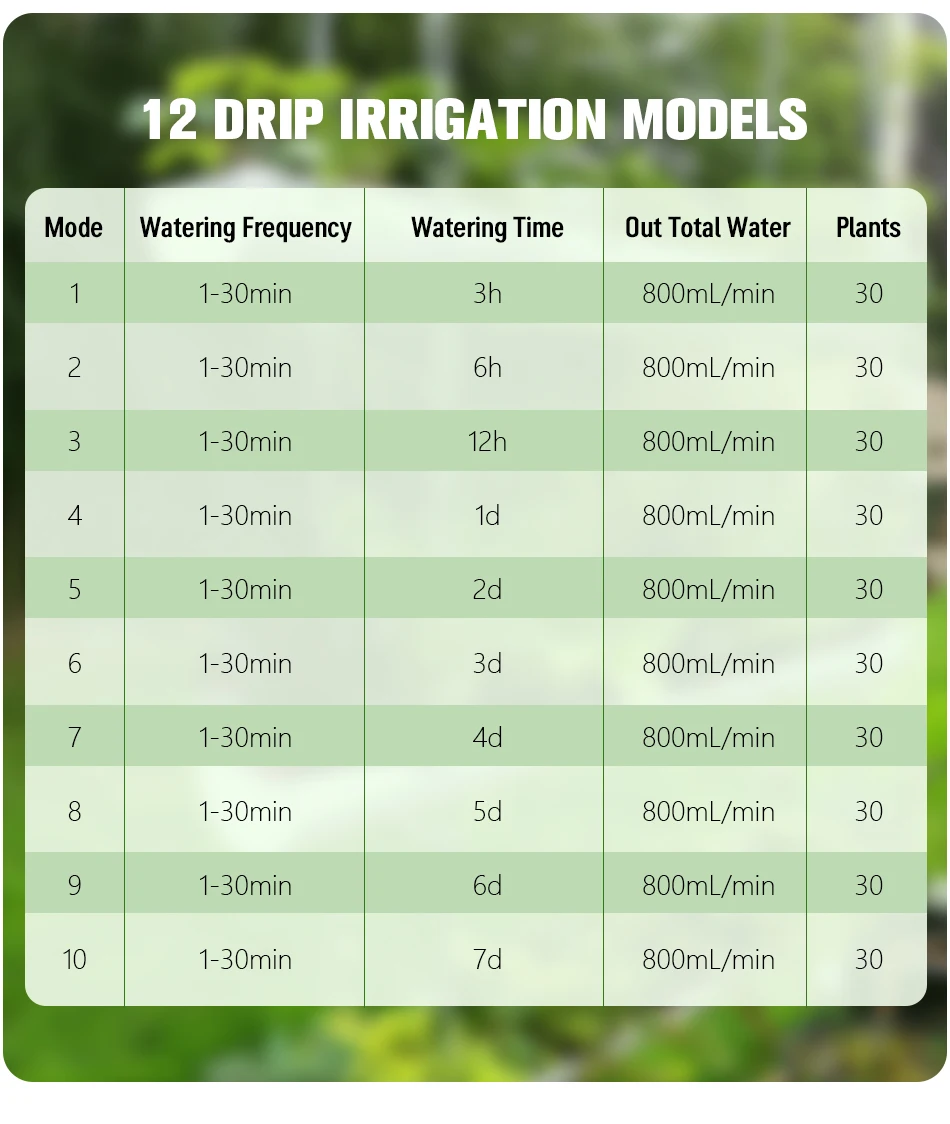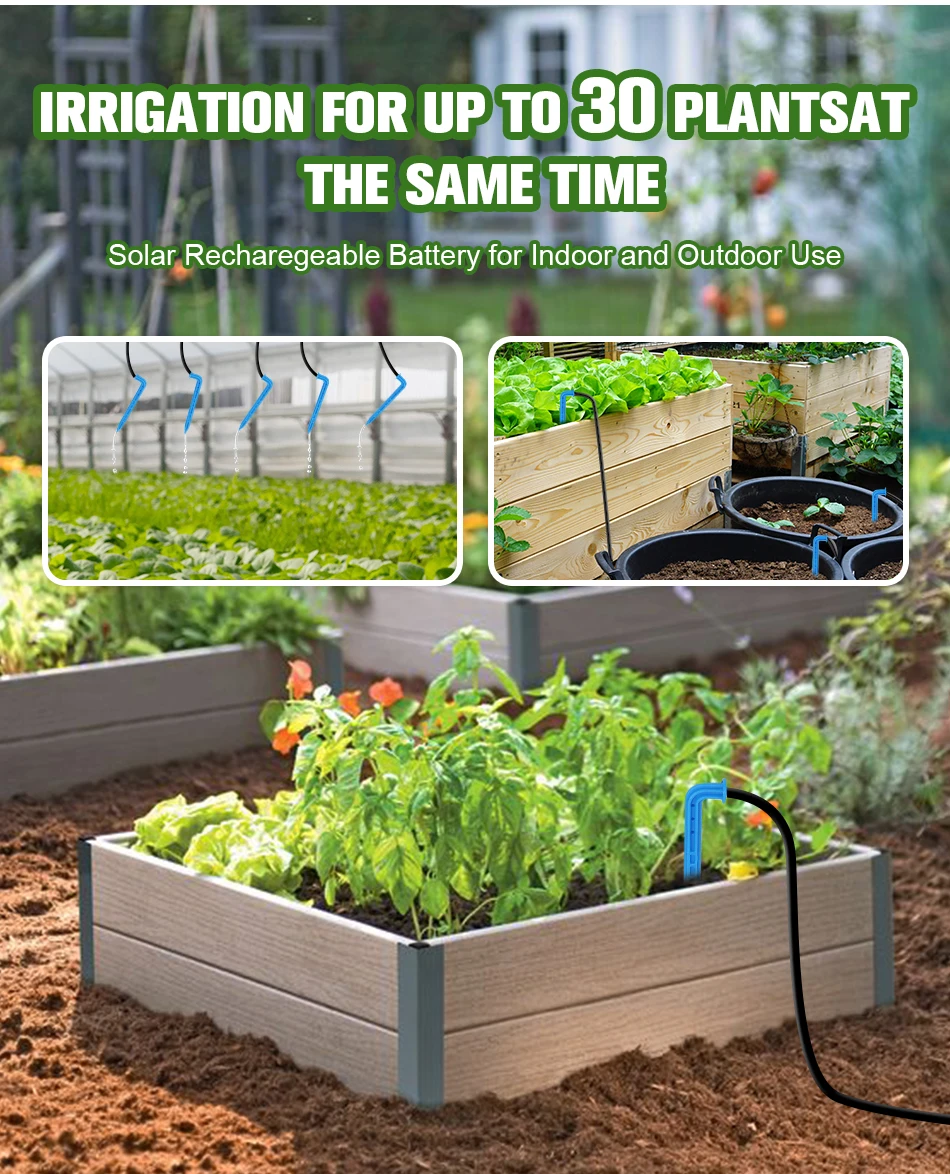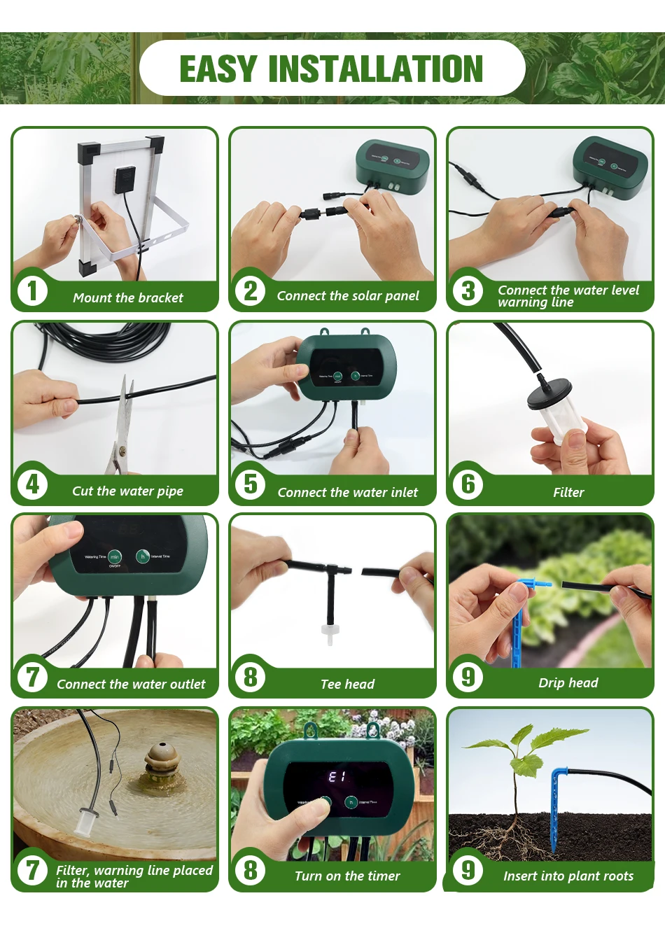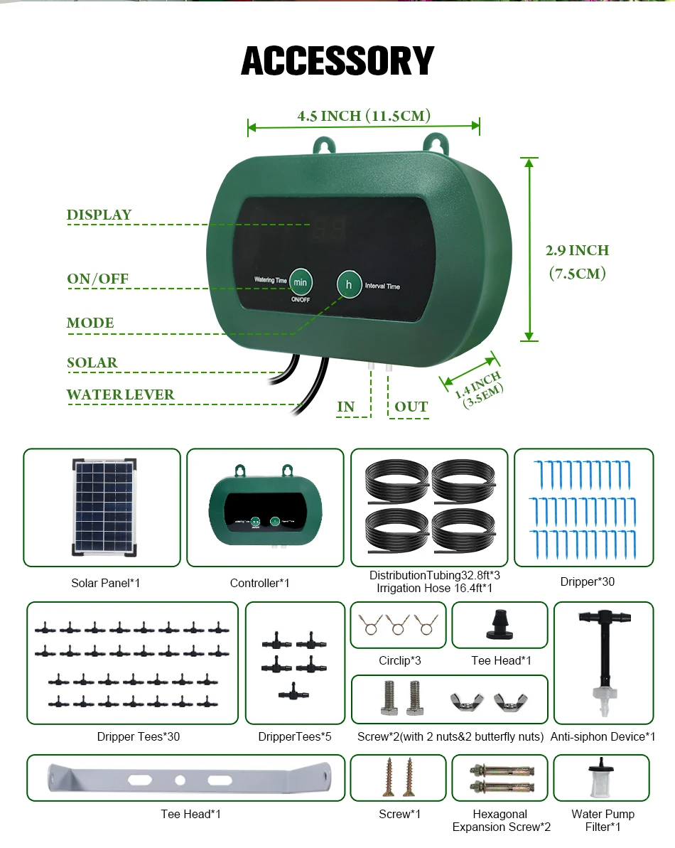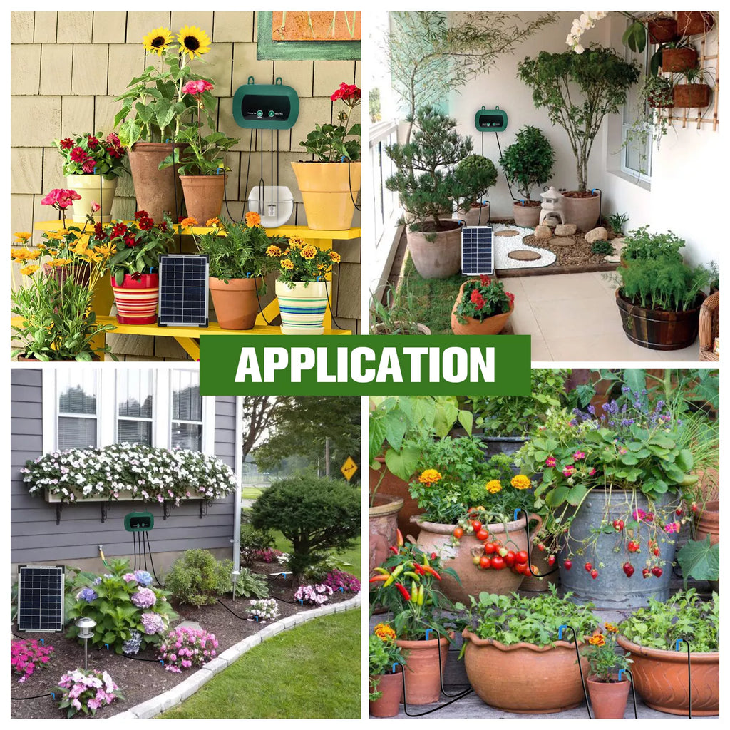 *【Powered by Solar Energy】Automatic watering system for potted plants is powered by solar energy. It’s a system of controller(solar panel, 2200mAh battery, 2w pump and timer), pipe and dripper that deliver the proper amount of water to each plant.There is no need to connect the power cord to charge the plant watering system, as long as the sun can reach the place toself-charging. * 【Take Water Anywhere】This solar plant self watering devices can take water directly from containers such as buckets /water tank, without the need for a tap. Excellent for yard, urban patios and balconies where faucets are unavailable. * 【10 Preset Precise Timer Watering Modes】Press the MODE to switch the watering frequency.. The watering flow from controller outlet is about 800ml (0.1gal) per minute, please select the number of dripper and the watering frequency according to your actual water demand of plants. * 【Outdoor & Indoor Use】The Automatic plant waterer are waterproof and need fix the controller in a position where the solar panel can be exposed to direct sunlight and the side with the switch button must be faced down, so it can keep the battery powered. The built-in battery has enough power to continuous work for 660 minutes on each full charge, ensuring that it can operate on cloudy days. * 【Worry-free Vacation】Settable timed mode of indoor plant watering system for vacation, Free your hands auto watering for plants with no worries of vacations, busy schedules, or weather changing. * 【Excellent Service】Valid 1 years warranty, any issue please contact us, we will solve it within 24 hours.