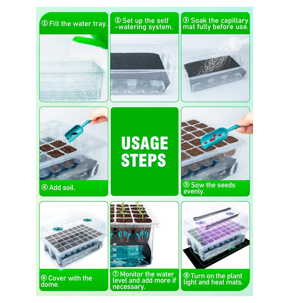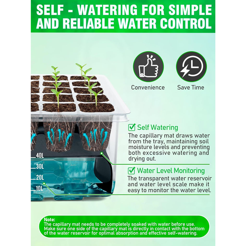 SIMPLE SELF-WATERING SYSTEM: Say goodbye to over-watering! Transparent seed starter tray flat and capillary mat maintain ideal moisture levels, preventing over watering or drying out. The water level line design, ranging from 1L to 4L, is highly legible. One watering supports seeds from germination to transplanting, making it ideal for both beginners and seasoned gardeners.