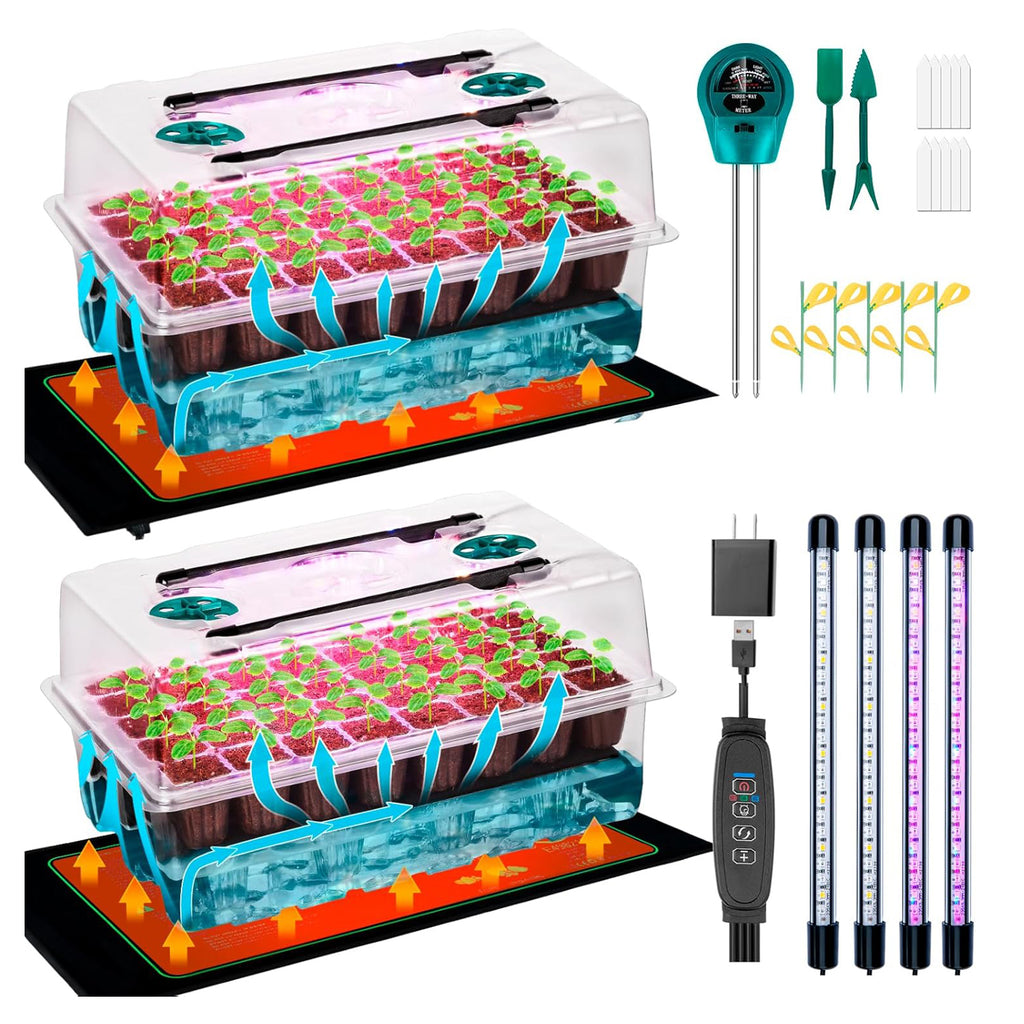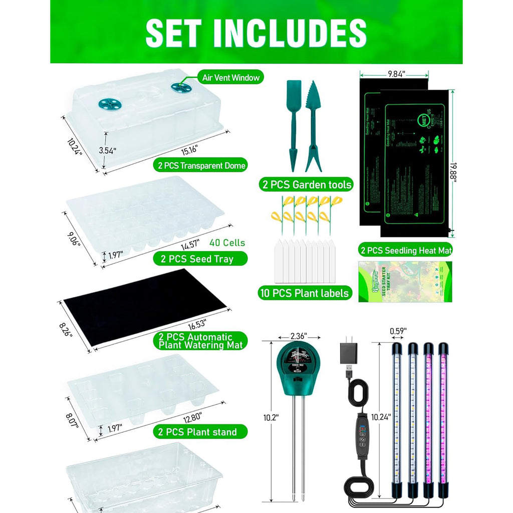 COMPLETE SEED GERMINATION KIT INCLUDES: 2* 40-Cell Seed trays, 2* Base trays, 2* Humidity domes, 2* Automatic plant watering mat, 2* Plant stand, a grow light system (4* LED light bars, controller, detachable adapter), 10* Garden labels, 2* Heat mat, 2* Garden tool, 1* 3-in-1 Moisture meter. Additionally, the transparent dome can accommodate two embedded LED light bars.