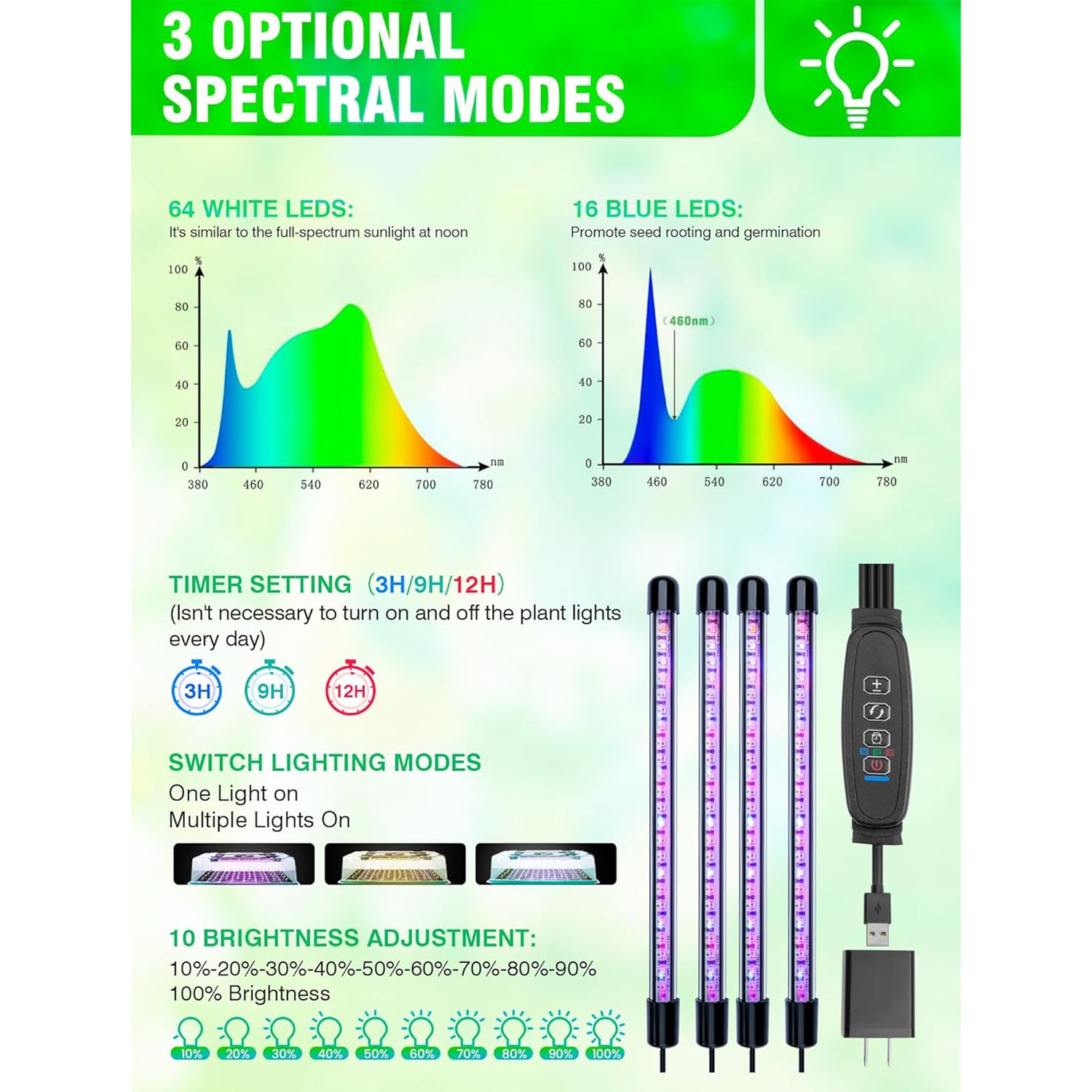 EMBEDDED ADJUSTABLE LED PLANT GROW LIGHT: Equipped with 48 high-efficiency beads per seedling tray, these LED strips simulate natural sunlight for optimal seedling growth. With adjustable brightness and timer functions, it meets the light conditions your plants need most at different stages, promoting faster, healthier growth.