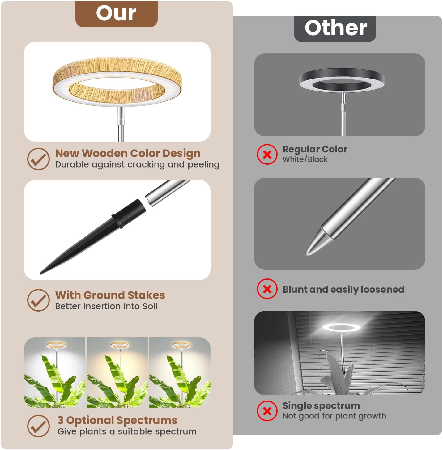 3 Lighting Modes for Plants & Spaces: 6000K white boosts focus for germination, leafy greens. 4500K warm white stimulates flower blooming and adds warm ambiance to living areas. Full spectrum 380-800nm supports seedlings, tropical plants, replicating sunlight. Combination of spectra and faux wood grain is an optimized choice to add a bright landscape to your interior.