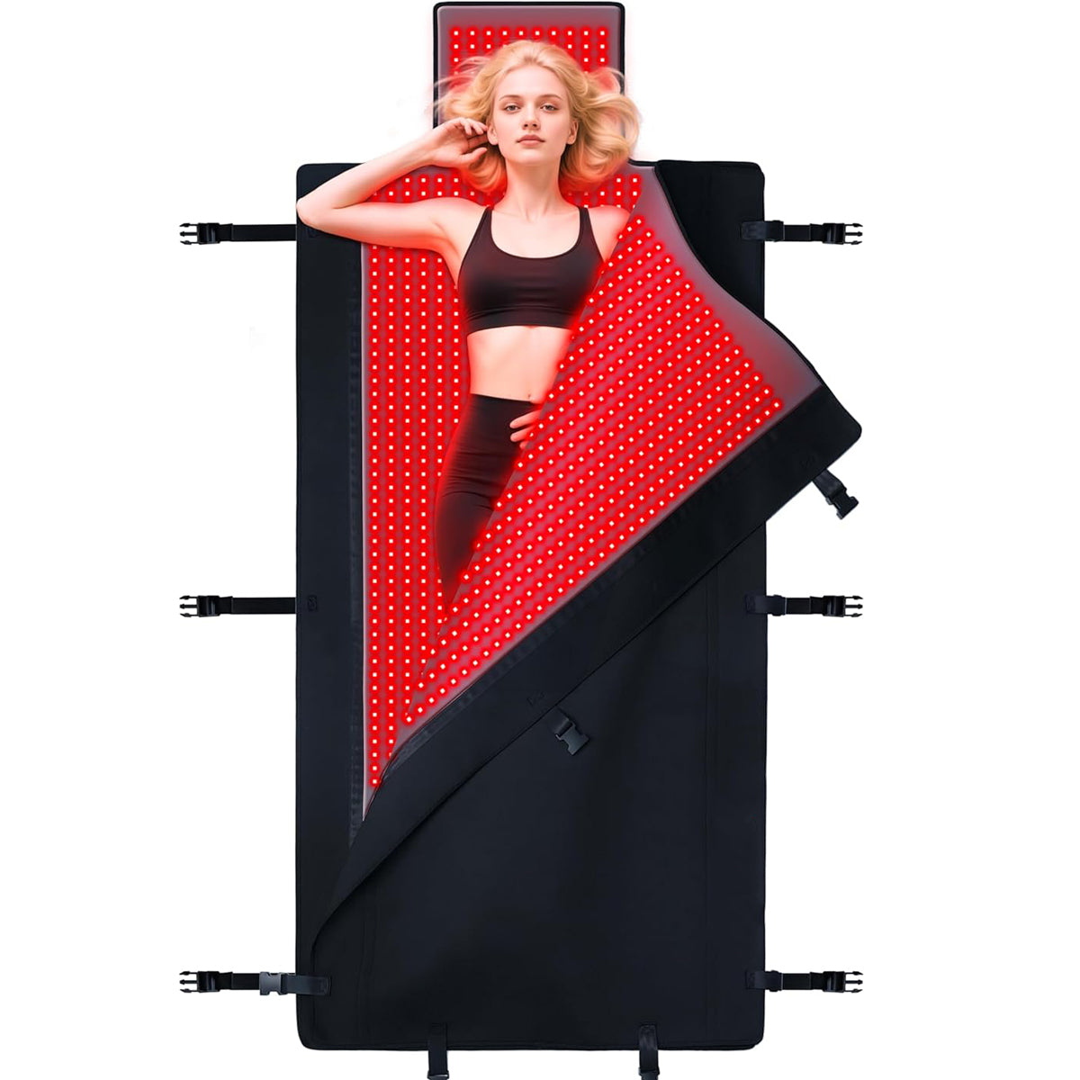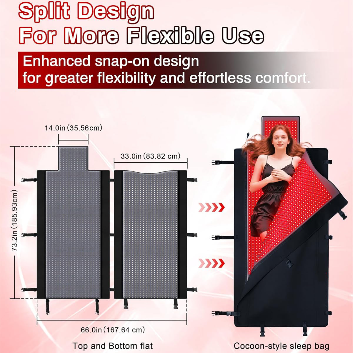 𝗙𝘂𝗹𝗹 𝗖𝗼𝘃𝗲𝗿𝗮𝗴𝗲 & 𝗠𝗼𝗱𝘂𝗹𝗮𝗿 𝗗𝗲𝘀𝗶𝗴𝗻: Designed with a 73"x33" layout and detachable dual-mat structure (Top + Bottom), it can be used flat or snapped together as a cocoon-style red light therapy sleep bag. Customized for home use, it provides targeted treatments from face to feet while covering the back, joints, and legs.