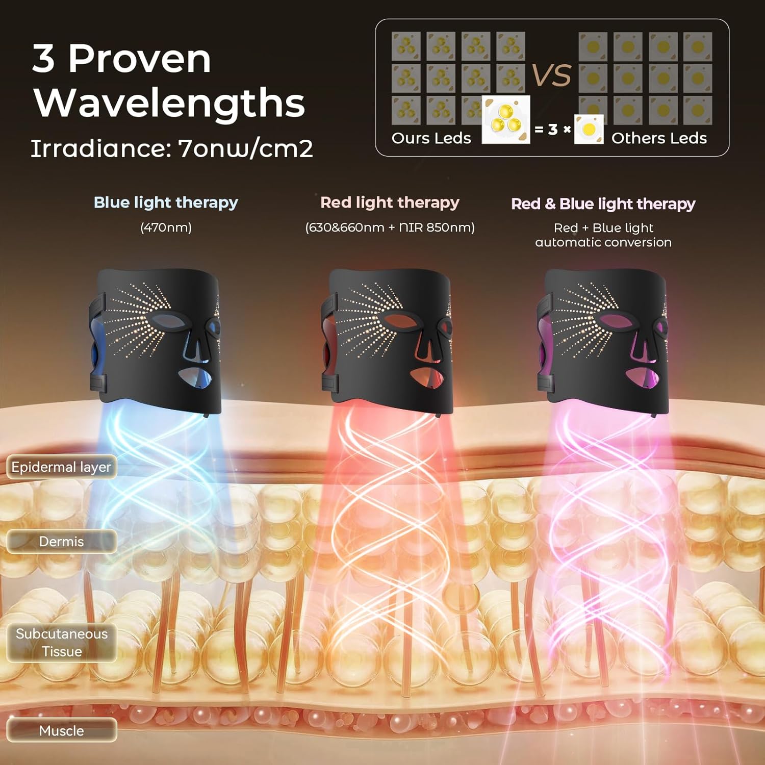 【3 Gears Red Light Therapy for Face】Red light (630nm) + Near-infrared light (830nm),3 gears. The combination of red light and near-infrared light which is the best combination to increase skin elasticity and gloss.Red light can help balance oil secretion. Red light helps improve skin redness. The irradiance of the product is 70nw/cm2. Experience the transformative effects of our red light therapy mask, designed to achieve rejuvenated, glowing skin.